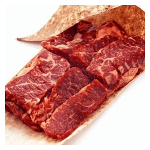 「厚切りカルビ」:牛肉(メキシコ)、醤油、砂糖、胡麻油、にんにく、生姜、コチュジャン(原材料の一部に卵を含む)